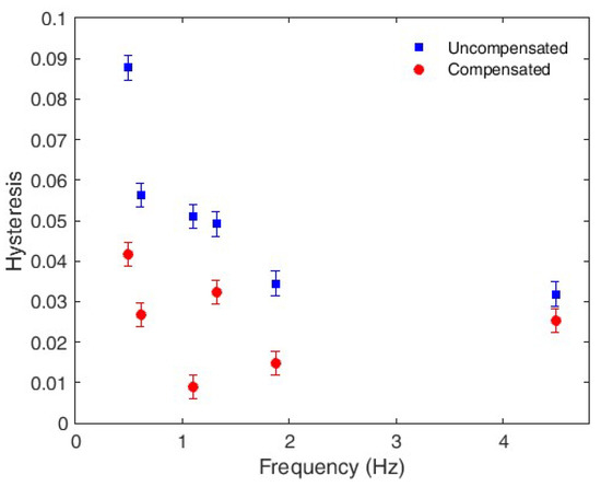 Verification of the second step of the compensation technique requires a comparison of the sensor hysteresis before and after the compensation. Once again, the results are presented as a function of the movement frequency. In this case, the uncompensated hysteresis showed a downward trend with increasing frequency. Although the hysteresis was reduced for all tested frequencies, it less effective for frequencies >1.5 Hz. Nevertheless, there is an improvement that is observed across the frequency range (see Figure 11).