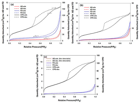 Nitrogen adsorption–desorption isotherms for air (AD), freeze (FD), and critical point (CPD) dried Eucalyptus samples with (a) ALEW, (b) 1% H2SO4, and (c) NaOH–steam pretreatments.