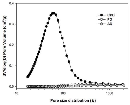 Figure 2 shows the corresponding biomass pore size distribution, which was determined by the BJH (Barrett–Joyner–Halenda) method. As reported elsewhere, the AD and FD samples’ large pores indicated a collapse of most of the small pore structures during drying []. However, the CPD showed distinguishable pore volume and appeared to maintain the pore structures in the pretreated Eucalyptus samples, with the average pore size of approximately 6.2 nm (i.e., within the mesopore range).
