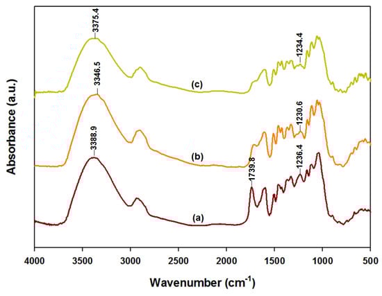 FTIR spectra for the dried Eucalyptus samples, before and after ALEW, as follows: (a) untreated control, (b) air drying (AD) after ALEW, and (c) critical point drying (CPD) after ALEW.