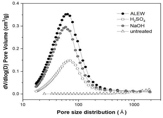 Since the pore volumes varied sharply with the pretreatment methods (Figure 5), we investigated the pretreatment condition influences on the pore volumes, surface area, and pore size distribution for the CPD Eucalyptus samples. The alkali pretreatment yielded a biomass with a higher pore volume and surface area than those that were achieved by the acid pretreatment. The swelling effects of the alkali pretreatment have been reported previously. Huang et al. showed that NaOH pretreated corn cob had an approximately 40% larger surface area (57.4 m2/g) than the corresponding sulfuric acid pretreated sample []. In the current study, the ALEW pretreatment exhibited the strongest swelling effect on the Eucalyptus samples, with an approximately 20% higher pore volume but similar average pore size, hence, an approximately 20% larger surface area than the NaOH–steam pretreatment.