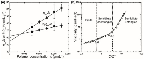 In the CS process, the morphology and structure of fibers are greatly affected by the concentration/viscosity of the polymer solution used. Previous studies indicate that during the CS process, the critical entanglement concentration (Ce) must be exceeded in order to form detect-free fibers [23,24]. Therefore, this section focuses on the determination of the Ce of the polymer solution. The critical chain overlap concentration, denoted C*, was used to identify the critical entanglement concentration (Ce). Using the C*, the boundary separating the rheological definition of different entanglement regimes in a polymer solution can be simply demarcated [20,25]. The point at which the concentration inside a single macromolecular chain is equal to the solution concentration, or C*, can be estimated as C*~, where is the intrinsic viscosity of the polymer solution.