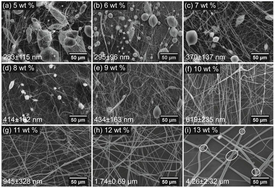 When the concentration reaches 13 wt %, interconnections between the fibers are observed on the fiber mat, as indicated by the white circles in Figure 3i. With the increment of fiber diameter, the heavy weight prevents the movement of fibers, and the fibers are still wet when they are deposited on the collectors, leading to the formation of a network structure in the fiber web.