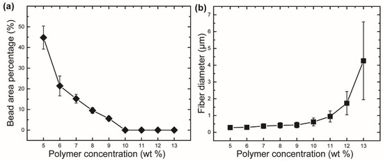 Variation of (a) bead area percentage and (b) fiber diameter of rPET fibers fabricated from various polymer concentrations. Centrifugal spinning condition: rotational speed, 15,000 rpm; needle inner diameter, 160 μm; collection distance, 10 cm.