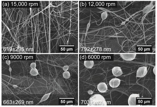 Bead-on-string fibers were observed to form when the rotational rate decreased from 15,000 rpm to 12,000 rpm or lower speeds. The bead diameter and bead area percentage of the samples also increased gradually when the used rotational rate was further decreased to 9000 rpm and 6000 rpm. This phenomenon is also due to the occurrence of Rayleigh break-up during the CS process. The decrease in the rotational rate leads to a shorter timescale of surface solidification, which is less than the timescale of Rayleigh instability [28,29]. The effect of the Rayleigh instability induced by the decrement of rotational speed is further evaluated by measuring the bead size and bead area percentage (BAP), as shown in Figure 6. The bead size and BAP are increased from 12.8 μm and 5.8% ± 1.4% to 32.4 μm and 18.2% ± 1.6%, respectively, when the rotation speed is decreased from 12,000 rpm to 6,000 rpm. Moreover, a gradual increase in the bead diameter corresponding to the increase in the rotational rate is also observed, as shown in Figure 6. The SEM images of these samples indicate diameters of 619 ± 235 nm (for 15,000 rpm), 792 ± 287 nm (for 12,000 rpm), 663 ± 269 nm (for 9000 rpm), and 703 ± 282 nm (for 6000 rpm). The highest fiber diameter obtained from fibers at a rotational speed of 12,000 rpm is attributed to the appearance of bead-on-string fibers.