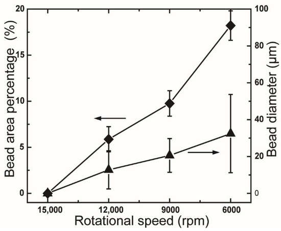 Bead area percentage and bead diameter of rPET mats fabricated under various rotational speeds. Centrifugal spinning condition: polymer solution concentration, 10 wt %; needle inner diameter, 160 μm; collection distance, 10 cm.