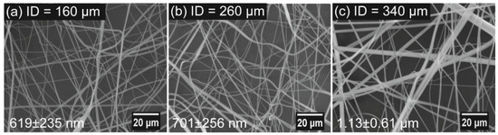 The effect of needle size on the morphology and diameter of rPET was also studied by spinning the polymer solution of 10 wt % rPET at a rotation speed of 15,000 rpm using needles with inner diameters (IDs) of 160, 260, and 340 μm. Figure 7 shows SEM images corresponding to needles of various IDs. Figure 7 shows that smooth, detect-free fibers were obtained for all samples fabricated using needles of various IDs. The fiber diameters are 619 ± 235 nm (for ID = 160 μm), 701 ± 256 nm (for ID = 260 μm), and 1.13 ± 0.61 μm (for ID = 340 μm). The increase in the polymer jet diameter induced by increasing the needle ID leads to the largest fibers in the final product.