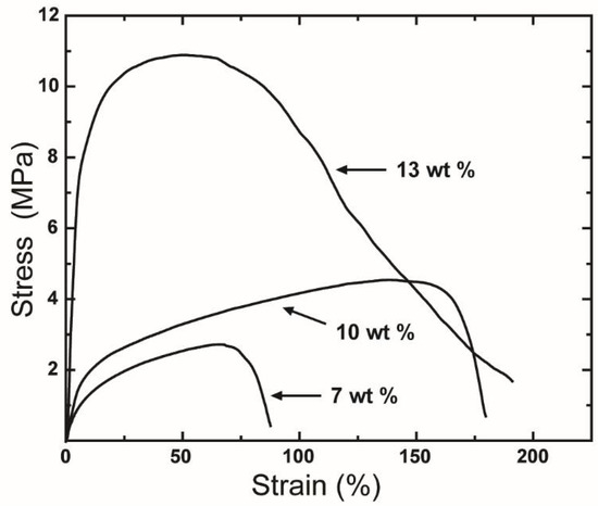 Tensile stress-strain curves of the fiber mats produced from polymer concentrations of 7, 10, and 13 wt %. Centrifugal spinning condition: rotational speed, 15,000 rpm; needle inner diameter, 160 μm; collection distance, 10 cm.