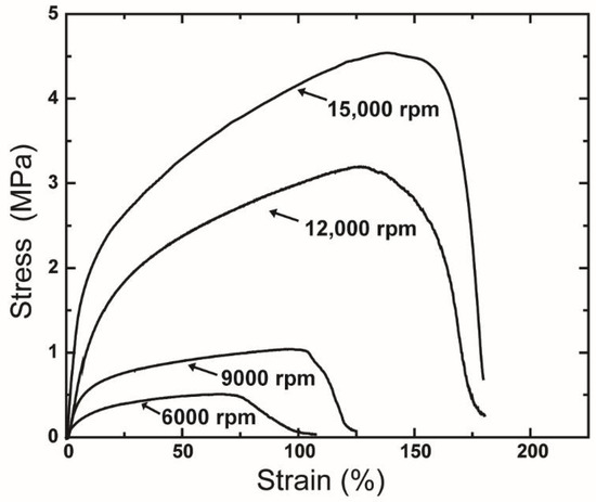Tensile stress-strain curves of the fiber mats produced under various rotation speeds. Centrifugal spinning condition: polymer solution concentration, 10 wt %; needle inner diameter, 160 μm; collection distance, 10 cm.