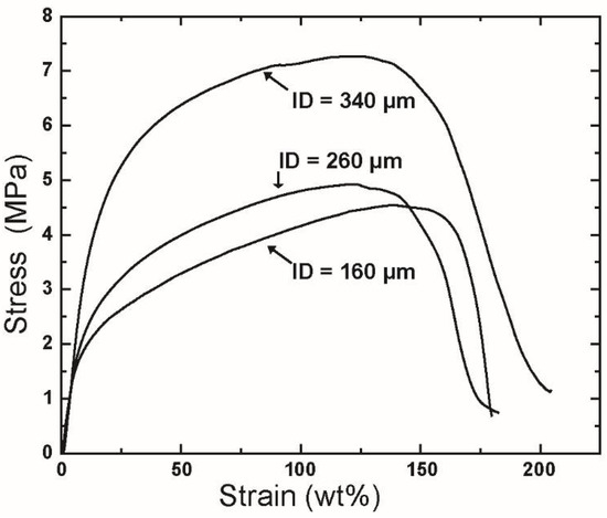 Tensile stress-strain curves of the fiber mats produced using needles with various inner diameters. Centrifugal spinning condition: polymer solution concentration, 10 wt %; rotational speed, 15,000 rpm; collection distance, 10 cm.