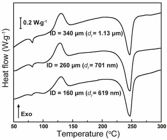 Figure 11 shows that the DSC thermograms of centrifugally spun rPET fibers are typical of those expected for PET fibers. The DSC curve of each sample exhibits an enthalpy recovery peak, an exothermic cold crystallization peak, and an endothermic melting peak, which were also observed in electrospun PET [6,34]. The enthalpy recovery peak obtained at around 80 °C is evidence of an oriented amorphous phase (mesomorphic phase) caused by the rapid solidification of stretched PET chains [6,34]. When the diameter of the fibers is increased, the amount of mesomorphic phase is also increased. This increment leads to the higher glass transition temperatures, Tg, of spun rPET fibers, as shown in Table 4. The crystallinity of these sample, as calculated by Equation (2), reveals differences of crystallinity between the different samples, as shown in Table 4. The crystallinity of fibers is 15.1% ± 0.1% (for ID = 160 μm), 13.1% ± 0.6% (for ID = 260 μm) and 11.6% ± 1.3% (for ID = 340 μm). When the fiber diameter is increased (increased ID), the centrifugal force acting on the polymer chains is decreased, leading to an increase in the amount of mesomorphic phase, and thus to a decrease in crystallinity. The effect of polymer concentration on the thermal properties of fibers was also observed, as shown in the Supplementary Materials section (Figure S1 and Table S1). The differences in the thermal behaviors of rPET fibers produced from various polymer concentrations are also attributed to the differences in fiber diameters.