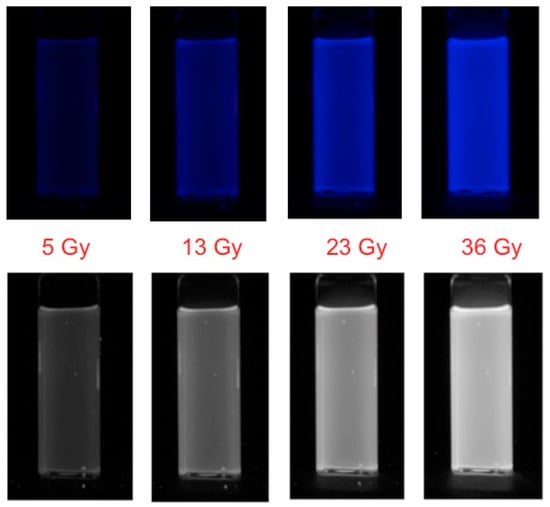 Upper: The full RGB color fluorescence in UV light of a 10 × 10 mm2 cuvette containing a 1.4 mM solution of maleimido-pyrene in tertiary-butyl acrylate, as a function of accumulated dose in a GC200 γ-ray source (dose rate ~2 Gy/min). Lower: The same cuvette with the fluorescence shown as blue-pixel gray-scale values.