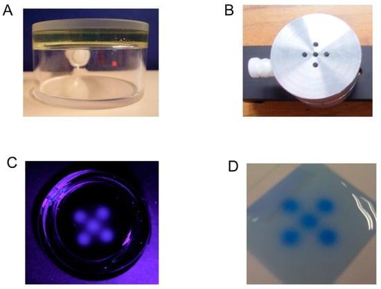 The first test measurement of fixed fluorescence imaging using the RFG gel production procedure described in the text. (A) A cylindrical spectrosil cell containing a (slightly yellow) 5 mm layer of a quasi-rigid gel containing ~1 mM MPy in TBA/15%PTBA. (B) The 5 mm thick aluminum mask for collimating the 3 MeV electron beam. (C) The fluorescent image of the gel in 365 nm light after irradiation with a dose of 20 Gy. (D) Comparison with a radio-chromic film irradiated under the mask to 10 Gy.