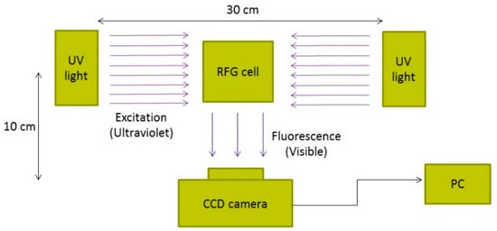 A schematic representation of the set-up used for fluorescence imaging of cells containing an irradiated RFG gel.