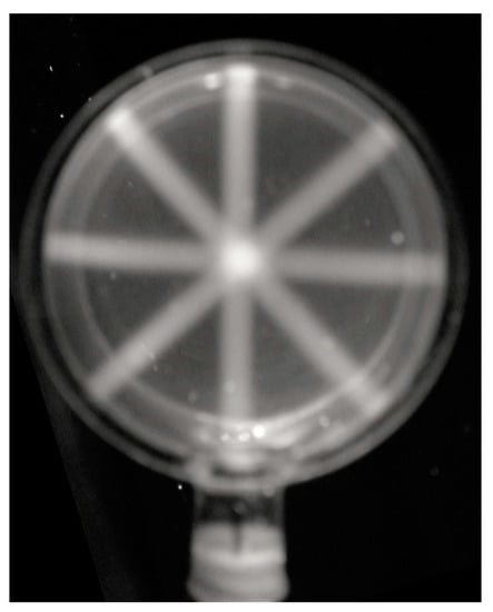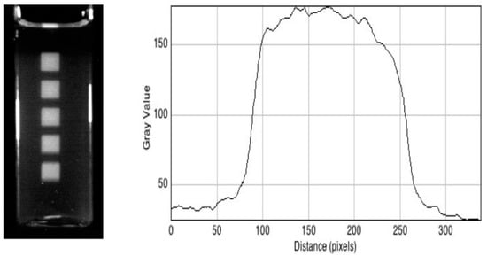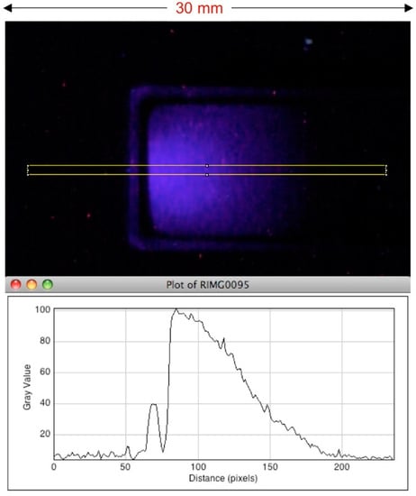 As mentioned in Section 1, the first test of an RFG gel for producing a fixed fluorescent image of a high-energy radiation field was carried out using the institute’s 3 MeV electron accelerator with an aluminum beam-mask, see Figure 3. Further e-beam experiments were carried out using a 10 × 10 mm2 cuvette with a single 3 mm diameter beam collimator fitted to its bottom. This allowed the image shown in Figure 6 to be made of the depth-intensity distribution along the propagation (Z) direction of the beam []. The form of the depth dependence is very close to that expected from the generalized depth–dose dependence for high-energy electrons in a medium of density ~0.9 kg/L [].