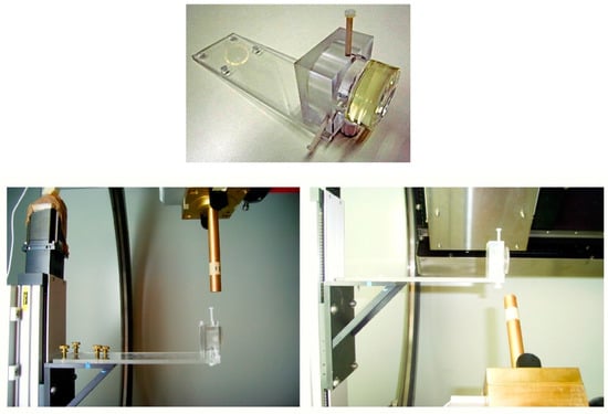Upper: the PMMA RFG cell holder with a 20 mm thick RFG gel in a 50 mm diameter quarts cell for measurements in a “small animal” microbeam X-ray irradiation facility at the Antonie van Leeuwenhoek Ziekenhuis (Nederlands Cancer Institute) Amsterdam. Lower: a 6 mm gel positioned under the beam collimator, which could be rotated over 360 degrees in the X/Y plane.