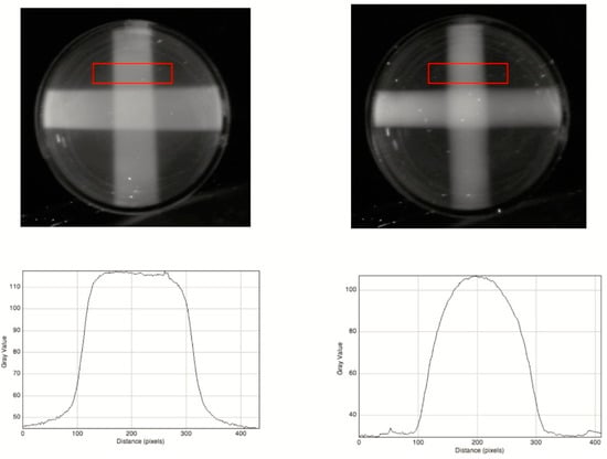 A 20 mm thick RFG gel irradiated with orthogonally-crossed X-ray beams. Upper left: a 10 × 10 mm square beam, Upper right: a 10 mm diameter round beam. Lower: pixel profiles across the beams as shown by the red rectangles. Pixel resolution 0.049 mm/pixel.