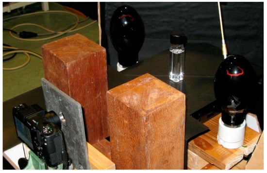 The set-up used to monitor, in situ, the fluorescence of an RFG gel on insertion of a seed of 192Ir. The main constituents are a 20 × 20 mm2 glass cell containing the gel into which a 1.9 mm diameter catheter (shown in Figure 15) is inserted via a septum cap; two mercury-arc UV (365 nm) lamps, a Ricoh GX200 digital camera with a lead shield against gamma irradiation and wooden shields against direct UV.