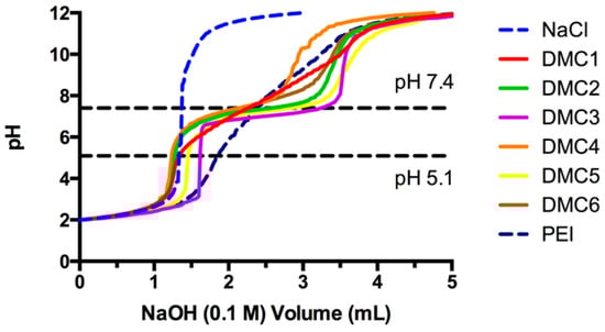 The obtained PAEs contain tertiary amines in their main chain that are prone to protonation in acidic milieu. Protonation not only grants the necessary positive charge to condense DNA into polyplexes, it also provides a buffer capacity to facilitate the endosomal escape of polyplexes through the proton sponge effect [34]. To evaluate the capacity of these polymers to accept protons in the endosomal acidification range (pH 7.4–5.1), titration experiments were performed. The titration curves for all PAEs are displayed in Figure 1, including the titration of reference component 25 kDa branched PEI, a commonly employed transfection agent, and blank NaCl solution (0.15 M). Plateaus along the titration curves in the pH 5.1–7.4 region are observed for all PAEs, which implies that there are pronounced buffer capacities. These buffer capacities range from 34% up to 64%, and are superior over PEI (18%). High buffer capacity of polymers is an excellent property to enhance endosomal escape which is necessary for the efficient gene delivery into the cytosol.