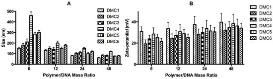 For efficient transfection, naked DNA requires protection by vectors, which can be realized by forming polyplexes through electrostatic interaction between DNA and cationic polymers [71]. Here, polyplexes were prepared by combining polymer solutions of DMC1-6 and DNA solutions at polymer/DNA mass ratios of 6, 12, 24, and 48. The resulting size and surface charge of the obtained polyplexes at these ratios are displayed in Figure 2. The polyplexes that were formed at polymer/DNA ratios above 6 exhibit hydrodynamic sizes from 80 to 200 nm and zeta-potentials from +20 to +40 mV. With increasing polymer/DNA mass ratios, the polyplexes become smaller in dimension and carry increased positive charge, corresponding to more tightly packed polyplexes and an increased number of cationic PAEs incorporated in the formation of these polyplexes [23,26,72]. Polyplexes formed at a polymer/DNA mass ratio of 6 display a relatively large size (over 400 nm) and an average surface charge of +15 mV, which indicates a rather loose structure. Polyplexes prepared from DMC1 and DMC2 have a relatively small size compared to other polymers at the same polymer/DNA ratios. This phenomenon is related to the higher cationic density of polymer DMC1, which bears additional amine groups, resulting in increased electrostatic interaction with DNA. The additional disulfide content of polymer DMC2 makes this polymer more flexible along the main chain, since the disulfide bond has a low rotational barrier, which also leads to more compact polyplexes. The other four polymers DMC3, DMC4, DMC5, and DMC6 form polyplexes with similar values in size and zeta-potential at identical polymer/DNA mass ratios, and no clear relation can be drawn between the polymer structure and the characteristics of the polyplexes here.