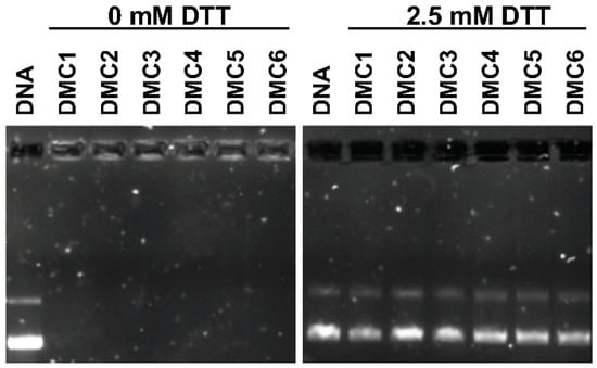 Polyplexes were prepared at a polymer/DNA mass ratio of 48, as described in the previous protocol. Polyplex solutions (90 µL) were diluted with either DTT HEPES solution (25 mM, 10 µL) or HEPES buffer (10 µL), and were incubated under ambient conditions for 30 min. The resulting dispersions (20 µL) were mixed with 6× loading buffer containing bromophenol (Ferments, 5.0 µL) and were aliquoted (10 µL) to load on agarose gel (0.8% w/v) containing 1× SYBR® Safe DNA Gel Stain (Invitrogen™, Carlsbad, CA, USA). The gel was developed at 90 V for 60 min in a TBE (Tris-borate-EDTA, 1×) running buffer and was consecutively imaged via FluorChem (Proteinsimple, Westburg, Leusden, The Netherlands) under UV excitation.