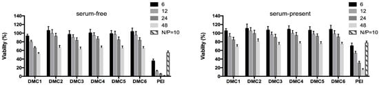 For biomedical applications, gene vectors require minimal toxicity and excellent biocompatibility towards cells and tissues [6,73]. It is therefore important to evaluate the cytotoxicity of the polyplexes before exploring their transfection performance. MTT assays were used to study the cytotoxicity profiles of the polyplexes towards COS-7 cells under serum-free (0%) and serum-present (10%) conditions. As shown in Figure 4, the viability of COS-7 cells under serum-free conditions is above 80% when treated with polyplexes prepared at polymer/DNA ratios of 6, 12, and 24 for all polymers, except for DMC1 which has the highest cationic density in the series due to the presence of extra secondary amino groups in the chain. In contrast, branched PEI (25 kDa) is considerably more toxic at the same polymer/DNA ratios. Under 10% serum conditions, cells show an even higher viability, and significant toxicity is only observed at the polymer/DNA mass ratio 48, indicating the promising potential of these PAEs for gene delivery under serum conditions.