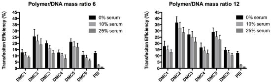 Transfection efficiencies of polyplexes prepared from bioreducible PAEs DMC1-6 and plasmid DNA at polymer/DNA mass ratios of 6 (left) and 12 (right). PEI is included as a reference at its optimal ratio of N/P = 10 in both graphs. COS-7 cells were exposed to polyplexes for 1 h and were incubated using various serum concentrations for 2 days. Transfection efficiency was quantified using FACS.