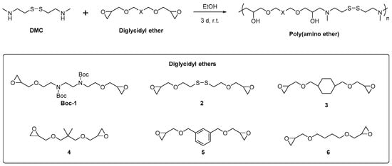 Cystamine is an interesting building block for biologically applied polymers, since its disulfide moiety renders the resulting polymers redox responsive. However, in combination with diglycidyl ethers, it may form branched or crosslinked structures due to the twofold reactivity of each of the primary amines [69,70]. The resulting structures suffer from poor water solubility, which impedes their application as gene vectors. In order to form linear polymers that are derived from cystamine disulfide, N,N′-dimethylcystamine disulfide (DMC), a cystamine analogue in which both amine groups are monomethylated was employed as the bifunctional amine monomer. The reaction of this amine with a series of diglycidyl ethers with structural variations yields water-soluble bioreducible linear poly(amino ether)s (PAEs) that are designed to be well applicable for efficient gene delivery (Scheme 1).