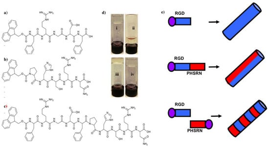 Molecular structure of three Fmoc-derived peptides. (a) Fmoc-FRGDF; (b) Fmoc-PHSRN; (c) Fmoc-FRGDFPHSRN and (d) hydrogels formed of (i) Fmoc-FRGDF; (ii) Fmoc-PHSRN; (iii) Fmoc-FRGDFPHSRN and (iv) peptide mixture of Fmoc-FRGDF/Fmoc-PHSRN (1:1, w/w). (e) Cartoon schematic of the assembly process.