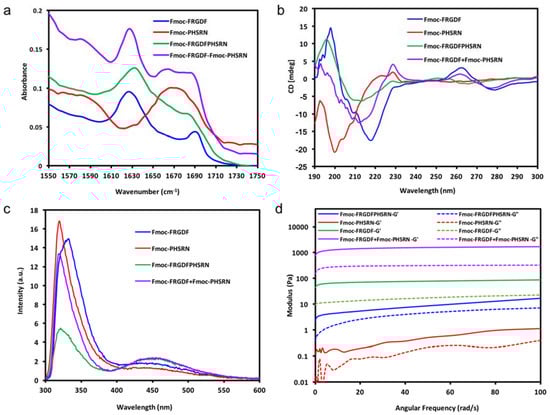 In each case, the FTIR and CD spectra indicate the organization of the molecules into a dominant structural ordering. Fourier transform infrared spectroscopy (FT-IR) was used to determine the dominant organization of the peptide backbone. As shown in Figure 2a, Fmoc-FRGDF, Fmoc-FRGDFPHSRN and Fmoc-FRGDF/Fmoc-PHSRN showed two distinct absorption peaks in amide I region at 1627 cm−1 However, in Fmoc-PHSRN alone, there was no evidence of a β-sheet structure around 1630 cm−1. Instead, an absorption peak with a maximum at 1667 cm−1 was detected, which represents random coil structure [] For the Fmoc-FRGDF/Fmoc-PHSRN peptide mixture, another peak centered at 1664 cm−1 was observed, indicating that in addition to the core of the β-sheet structure, other secondary structures predominantly composed of an element of random coil suggesting that the spatial requirements for the packing of the two peptides, particular those including proline, is not ideal. The peak at 1664 cm−1 is absent in the spectra of Fmoc-FRGDF peptide; it is suggested therefore, that conformational constraints introduced by the Fmoc-PHSRN peptide have an impact on the β-sheet based supramolecular structure formation in Fmoc-FRGDF.