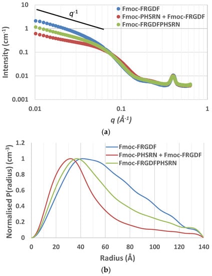 (a) SAXS scattering curve of SAPs Fmoc-FRGDF and Fmoc-FRGDF/Fmoc-PHSRN displaying q−1 relationship at low q angles. (b) P(r) inversion plot of SAPs Fmoc-FRGDF and Fmoc-FRGDF/Fmoc-PHSRN.