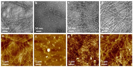 Nano- and microstructure of hydrogels (top panel TEM images and bottom panel AFM images). (a,e) Fmoc-FRGDF; (b,f) Fmoc-PHSRN; (c,g) Fmoc-FRGDFPHSRN and (d,h) peptide mixture of Fmoc-FRGDF/Fmoc-PHSRN (1:1, w/w).