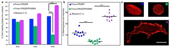 (a) Cell viability of HMFCs on peptide hydrogels. HMFCs were cultured on hydrogels containing peptides Fmoc-FRGDF, Fmoc-FRGDFPHSRN and peptide mixture (coassembled Fmoc-FRGDF/Fmoc-PHSRN) for three days. MTS assay was performed and the absorbance values were obtained at a wavelength of 490 nm. Absorbance value of cells grown on Fmoc-FRGDF was considered as control. A p-value of <0.05 was considered significant. (b) Analysis of spreading area: HMFCs were cultured on hydrogels containing peptides for 48 h. Cells were stained with actin and the images were obtained using fluorescent microscope (20× magnification). ImageJ analysis was performed and the values were plotted in a graph using GraphPad Prism, the p-value **** <0.05 was considered statistically significant. (c) Actin staining of HMFCs growing on hydrogels shows typical morphologies for each condition measured in (b) scale bar 10 µm.