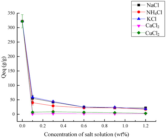 3.3.2. Absorbency Capacity in Different Salt Solutions