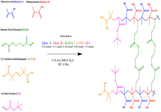 Synthesis of non-imprinted polymers required charging a Rayonet RPR-100 500 mL photochemical reactor (Branford, CT, USA) with 6.31 mL of methacrylic acid (72.6 mmol, 0.7 eq), 2.65 g of methacrylamide (31.1 mmol, 0.3 eq), along with a varied amount of tert-butyl acrylate (1 mol %, 0.110 mL; 3 mol %, 0.330 mL; 5 mol % 0.550 mL), 0.962 mL of EGDA (5 mol %, 6.18 mmol), and 103.5 mL of DIUF H2O (5.74 mol). The reaction mixture was sparged with nitrogen for 30 min before 0.185 g of the 2,2-azobis(2-methylpropionamidine) dihydrochloride initiator (0.6932 mmol, 0.6 mol %, 6.8 × 10−6 eq) was added. The reaction was stirred for 4–6 h while bubbling nitrogen through the reaction to increase resin porosity. The reaction mixture was vacuum filtrated and rinsed with DIUF water to remove residual unreacted starting materials [16].