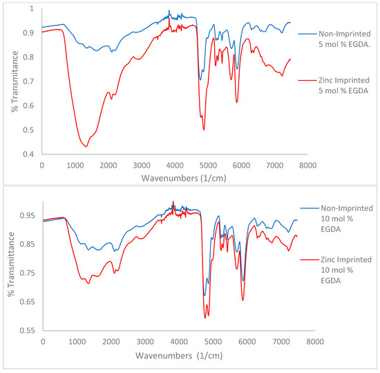 A key characteristic noted in the IR spectra of all polymers is the presence of water remaining after lyophilization, as seen as a bigger OH stretch at 2800–3500 cm−1. The amount of water remaining in the polymer decreases with increasing crosslinker density (Figure 3, from top to bottom). This indicates that more crosslinker will limit both zinc’s and water’s ability to access pores within the polymer. Hydrogen bonding can be determined via IR as well. Methacrylic acid contains a carboxylic acid C=O bond whose spectral signature is a sharp, strong peak between 1710–1780 cm−1. Methacrylamide contains an amide C=O whose spectral signature appears as a sharp, strong peak within 1630–1690 cm−1 [23,24].