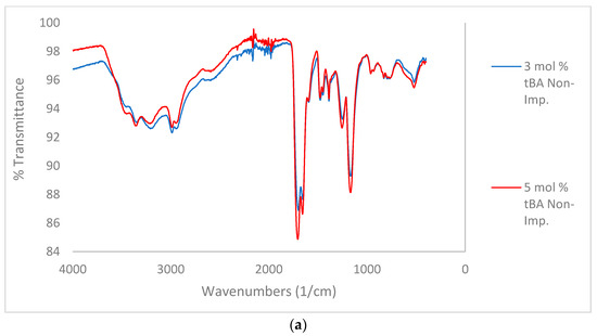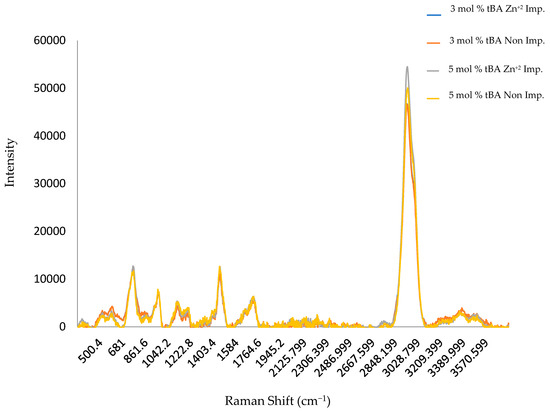 The same set of polymers used in Section 3.1 were also subjected to RAMAN analysis. The same increase in carboxylate intensity for non-imprinted materials can roughly be observed along with the increase in amide intensity for imprinted materials seen within Figure 6. The carboxylate (C=O) peaks are shown to have a RAMAN shift of roughly 1710–1755 cm−1, C-N amide of 740–850 and 1000–1250 cm−1, and OH of 3000–3600 cm−1. Raman, however, more strongly shows the peaks for the hydrophobic backbone of the polymer. These peaks do not show any shift with tBA concentration. This indicates that the changes in structure mainly occurs in the side chains [24,26]. The peak at 3000 cm−1, however, increases with tBA concentration, suggesting that the co-monomer is incorporated into the polymer structure at increasing amounts.