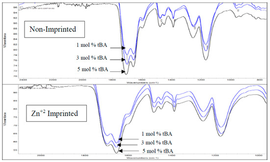In the comparison between non-imprinted and imprinted polymers containing variable concentrations of tBA (Figure 4a,b), high amount of water is still retained by the imprinted polymers after lyophilization. This is likely due to the zinc ion speciation. Zinc chloride preferentially forms zinc hexahydrate when dissolved in water [25]. Therefore, it is likely that water ligands imprinted into the polymer structure as well, and structural water is more difficult to remove.