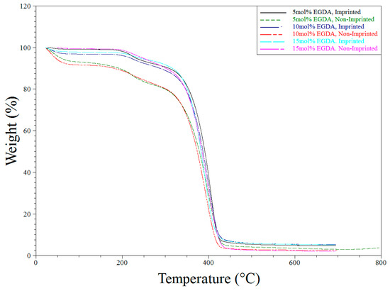 Figure 7. TGA degradation of all polymers synthesized for the variable EGDA study.