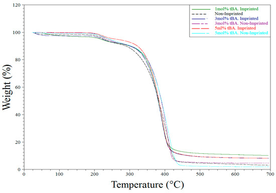 All polymers were characterized by infrared spectroscopy, thermogravimetric analysis, and differential scanning calorimetry. Variations in porosity due to changes in crosslinker and tBA concentrations as well as imprinted vs. non-imprinted polymers, were tracked using Brunauer–Emmett–Teller (B.E.T.) surface area and pore size measurements using physisorption equipment.