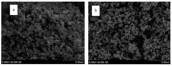 Figure 9. SEM mages: (a) non-imprinted 5 mol % EGDA, 3 mol % tBA; and (b) zinc imprinted 5 mol % EGDA, 3 mol % tBA. Both images are under 6000× magnification.