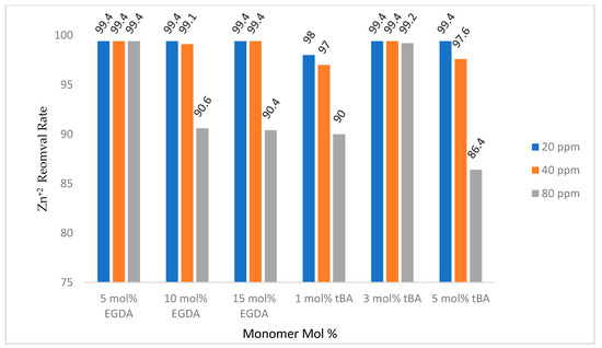 Figure 10. Gravity column removal rates for all tBA and EGDA non-imprinted resins. The ppm values are for Zn+2 solutions. All polymers with varying EGDA contain no tBA. All polymers with varying tBA contain 5 mol % EGDA.