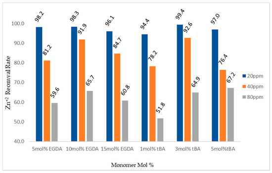 Figure 11. Gravity column removal rates for all tBA and EGDA imprinted polymers. The ppm values are for Zn+2 solutions. All polymers with varying EGDA contain no tBA. All polymers with varying tBA contain 5 mol % EGDA.