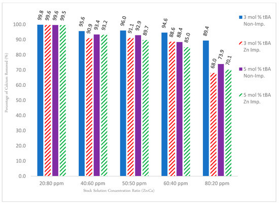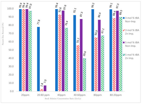 Figure 12. Gravity column results for both unary and binary ion studies for 3% and 5% tBA, both imprinted and non-imprinted. Removal percentages are edited to reflect the rate of removal for zinc for the binary ion studies. All polymers contain 5 mol % EGDA crosslinker.