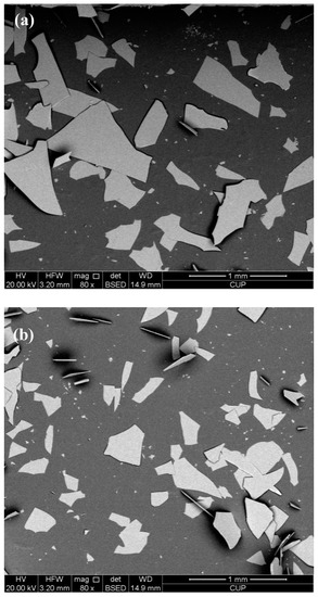 Nitrile rubber (N215SL, contain with 48% of acrylonitrile, JSR Corporation, Tokyo, Japan) was used as basis material. Sulfur (99.5% purity, Langfang, China) was purchased from Kezhan Chemical Company and used as the curing agent. The micro glass flakes (GF, ‘C’ glass) were supplied by Glassflake Australia Pty Ltd. (Perth, Western Australia). The chemical constituents of micro glass flake are given in Table 1. Three styles of GF with different lengths are employed as filler in this study. The micro morphology of the three styles GF with different sizes are shown in these SEM images (Figure 1). The average lengths of three styles GF are 425 um, 300 um and 35 um, respectively. The nominal thickness of the glass flake is around 5 ± 2 μm. Thereafter, the filled NBR with three GF are represented as GF-B, GF-M and GF-S for lengths of 425 μm, 300 μm and 35 μm, respectively.