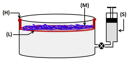 In order to achieve confined growth of bacterial cellulose nanofibers, CA electrospun nanofiber membranes (CA-ENM) were used as a support. BC/CA-ENM hybrid mats were thus produced by means of an in situ self-assembly approach in a static incubator, containing the aforementioned culture medium. CA-ENMs were laid on a sterilized stainless steel thin wired lattice (L), which was securely placed inside glass container, and stabilized by supports (H), as shown in Figure 1. Afterward, the culture medium was injected into containers and inoculated using a BC producing strain, keeping the other parameters as reported earlier. Based on pre-experiments, the electrospun CA nanofiber membrane (M) was positioned slightly below (i.e., 1–2 mm) the surface of the culture medium throughout the fermentation period to allow the BC fibers to cover the top and grow freely between the openings and pores of ENMs. The size of the lattice and ENMs was the same as the surface area of the culture media. A specially customized microfluidics system (S) was connected to maintain the initial surface level and provide nutrients to the culture media as needed. The BC-modified mats were harvested after periods of three, five, and seven days to analyze the results of in situ self-assembly. After the complete incubation period (seven days), a layer of BC nanofibers was clearly observed to have self-assembled on the surface of CA-ENMs, forming a BC/CA-ENM hybrid structure. Hybrid mats were then purified, frozen, and vacuum dried following the same method described earlier. The average thickness of the dried hybrid mats was ~128 μm.