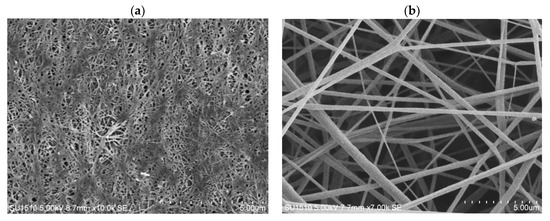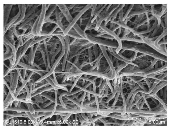 In general, BC-based nanocomposites are produced, either via blending BC with a second phase once the nanofiber network structure has formed or by the addition of a second phase into the culture media during the formation of the nanofibrous matrix, to create a double network structure [28,29,30]. In the these approaches, BC can be regarded as a matrix reinforced with polymeric or mineral fillers, or as an additional reinforcement to another polymer [28]. In situ self-assembly, electrospinning, particle deposition, dispersion, and casting methods have been utilized to improve the physical and functional properties of BC nanocomposites [7]. Electrospinning is a versatile and simple technique used to fabricate submicron polymeric nanofibers with different diameters and varied morphologies. It enables nanofibers to form a highly porous mesh with controlled pore size, also referred to as electrospun nanofiber membranes (ENM). ENMs have unique and interesting features, such as high surface area to volume ratio, good permeability, large porosity, good mechanical properties, etc. [31]. Some researchers have reported the use of BC whiskers/nanowhiskers as a reinforcement for electrospun nanofibers, where BC nanowhiskers were introduced into solutions prior to electrospinning [32,33]. The use of an in situ self-assembly approach to fabricate nanofiber-based hybrid fibrous structures, by directly adding microfibrillated cellulose (MFC) and natural fibers to the fermentation (culture) medium, helped achieve better mechanical properties [34].