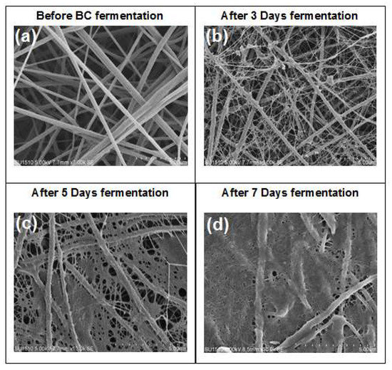 SEM images for BC/CA-ENM hybrid mats; surface morphology: (a) before fermentation; (b) after three days of fermentation; (c) after five days; and (d) after seven days.