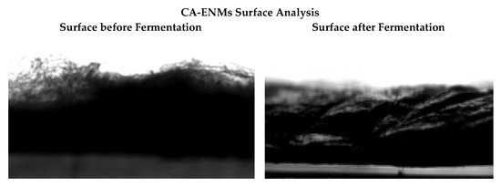 Photographs of CA-ENM surfaces before fermentation (left) and after seven days of fermentation (right).
