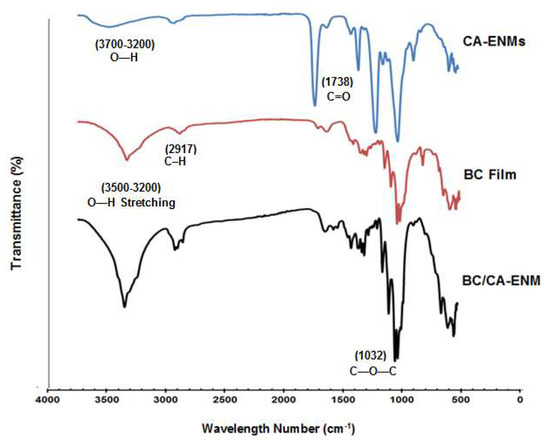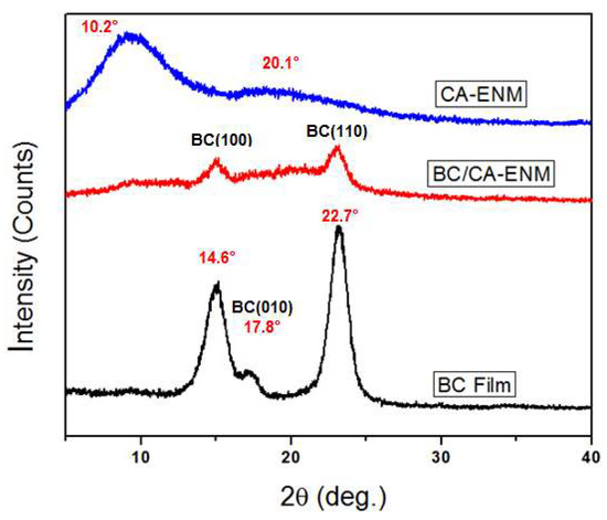 BC is a semi-crystalline biomaterial that usually produces three major characteristic crystallinic peaks when analyzed through XRD. Figure 7 demonstrates XRD patterns of BC film, CA-ENM, and BC/CA-ENM samples. According to the Debeye-Scherrer equation [42], as below,